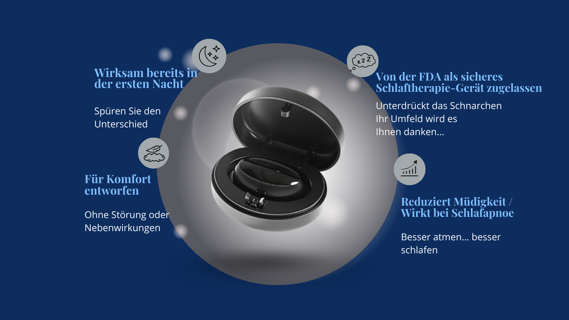 Meine Frau hat mich fast jede Nacht wegen meines Schnarchens geweckt. Ich habe Mundstücke, Sprays, alles mögliche ausprobiert. Das ist das erste, das wirklich funktioniert hat—und ich muss es nicht einmal beim Schlafen tragen. Absolute Erleichterung.“